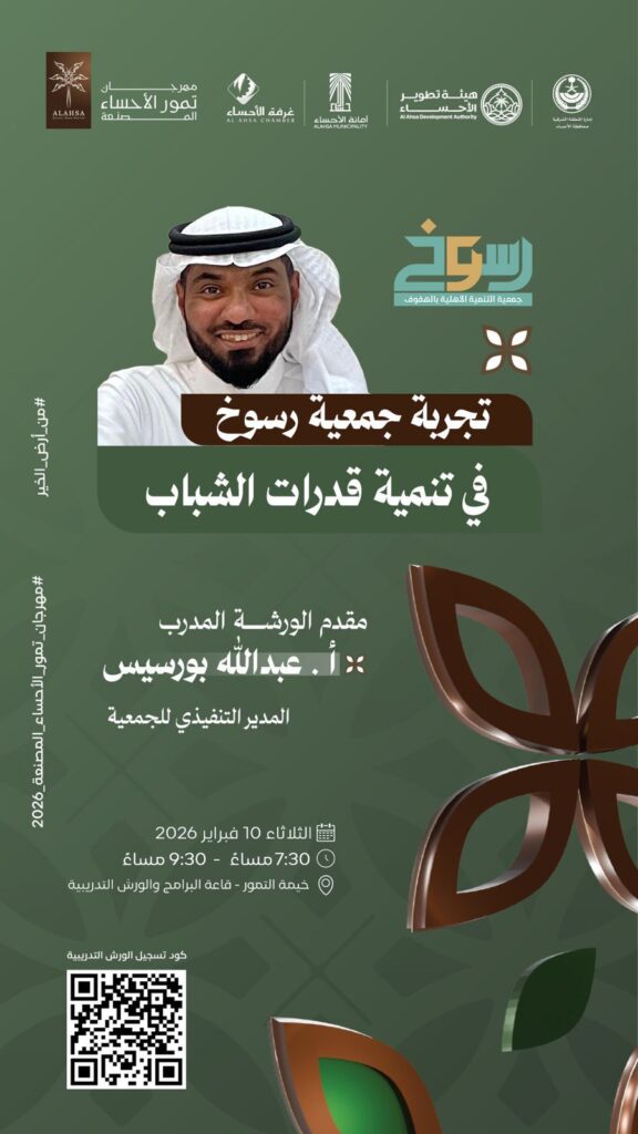 نفذت جمعية رسوخ ورشة تدريبية بعنوان “تجربة جمعية رسوخ في تنمية قدرات الشباب” بالتعاون مع أمانة الأحساء، بهدف تسليط الضوء على الممارسات والتجارب النوعية في تمكين الشباب، وتعزيز مهاراتهم الشخصية والمهنية، واستعراض البرامج والمبادرات التي تسهم في بناء قدراتهم ورفع جاهزيتهم لسوق العمل ، وجاءت الورشة ضمن فعاليات مهرجان تمور الأحساء المصنعة 2026، وقدّمها سعادة […]