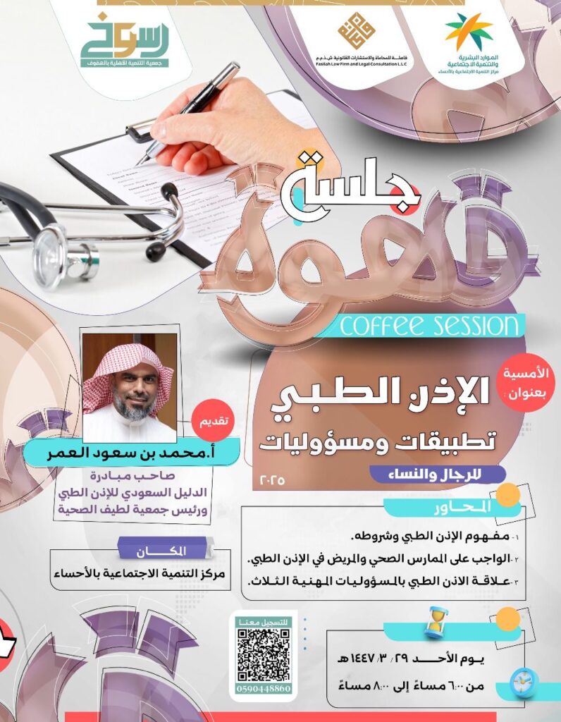 أقامت جمعية رسوخ أمسية ضمن سلسلة أمسيات “جلسة قهوة” بعنوان “الإذن الطبي.. تطبيقات ومسؤوليات”، وذلك بالتعاون مع شركة فاصلة للمحاماة والاستشارات القانونية ومركز التنمية الاجتماعية بالأحساء. وقد قدّم الأمسية الأستاذ محمد بن سعود العمر، حيث تناول خلالها الجوانب النظامية والعملية المتعلقة بالإذن الطبي، وأبرز التطبيقات المرتبطة به، إضافةً إلى ما يترتب على ذلك من مسؤوليات […]